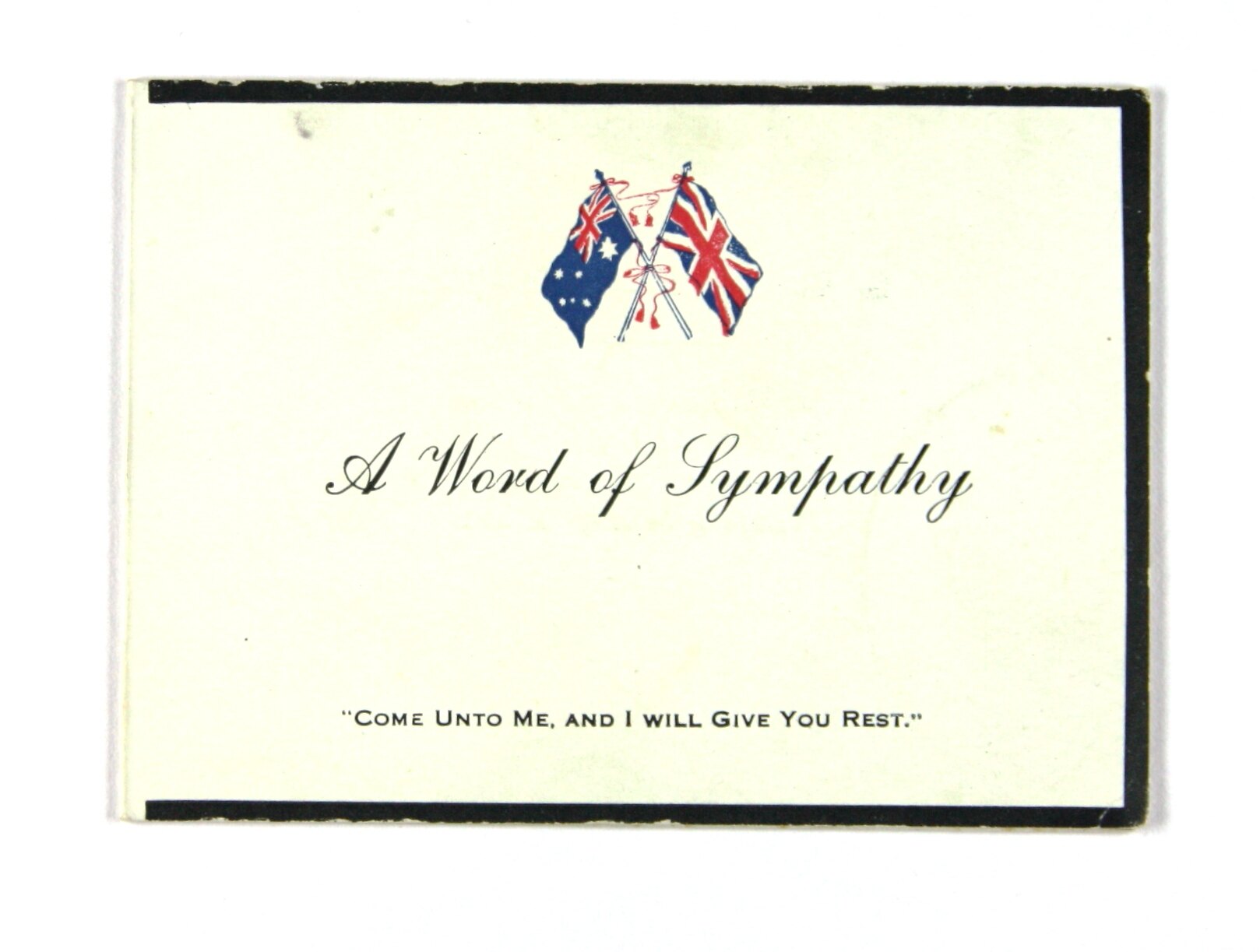 Card comprising heavy white paper, folded in half to form four leaves. Front has black border around, flags of Australia (blue ensign) and Great Britain and words 'COME UNTO ME, AND I WILL GIVE YOU REST.'. Text on both inside pages, largely printed, with line for personal inscription, completed in hand-writing. The back cover the the card is blank. Two distinct patches of discolouration along top edge of card.