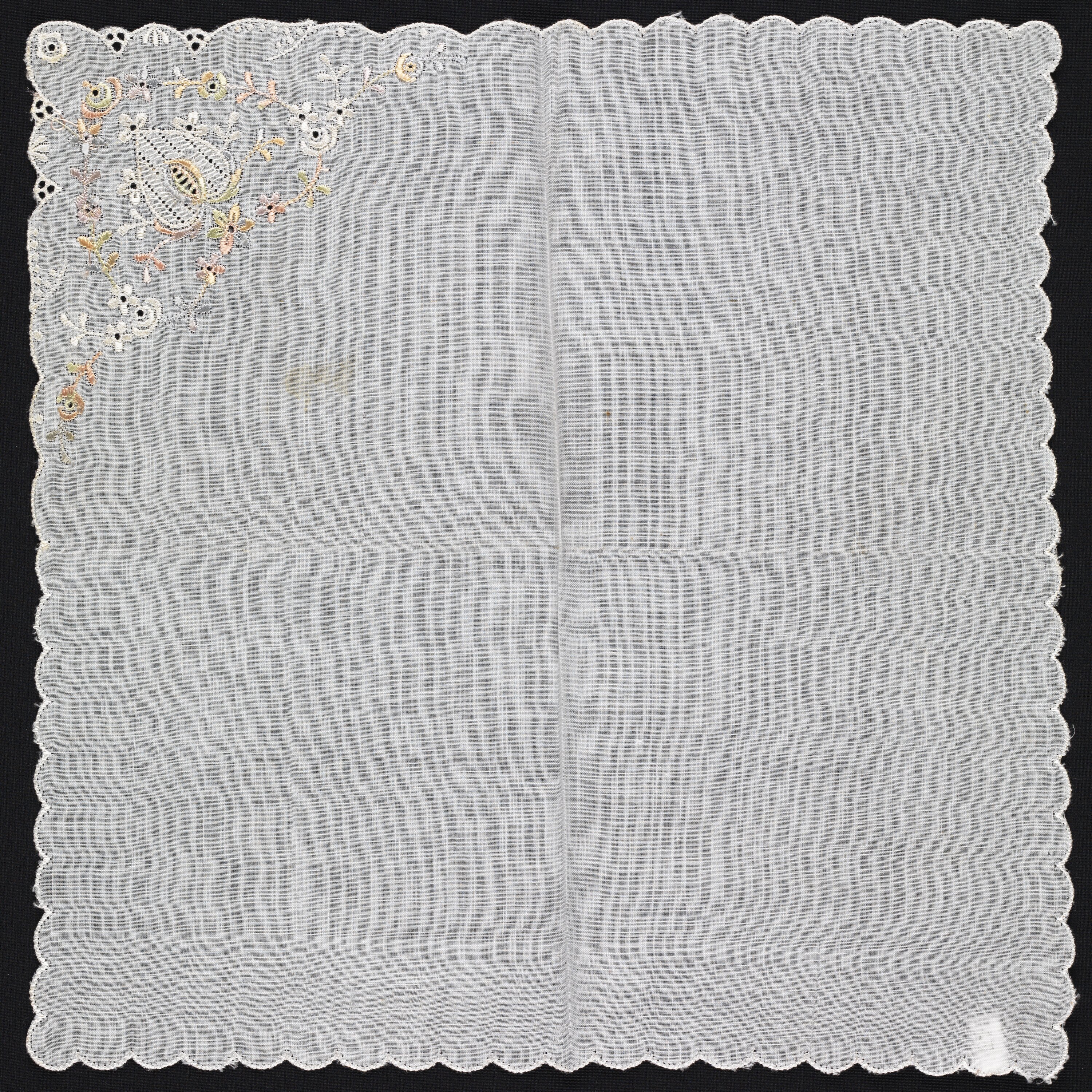 Fine white cotton handkerchief with scalloped, finished edge. One corner features an embroidered design in white and multicoloured, variegated thread featuring a central heart shape and garlands of flowers.
