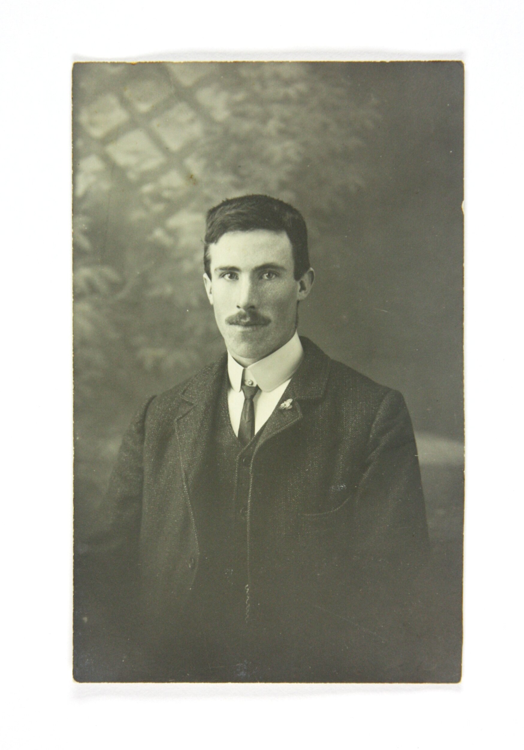 Portrait of man, to waist only. He wears a suit jacket and vest, with tie and high collar, and a small badge on one lapel. He wears a moustache. The photograph may have been taken in a studio, with an image of lattice and vegetation behind him.