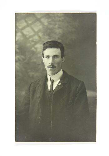 Portrait of William (aka Bill) Nairn printed on postcard, made some time between about 1910 and 1915. William was later killed in the trenches of France during World War I, on 4 July 1918.