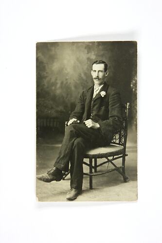 Man wearing three-piece suit, seated on cane chair in a photographic studio. He wears a pale shirt, tie and buttonholed flower. His boots are worn and scuffed, but his hair is combed neatly. He sports a moustache.