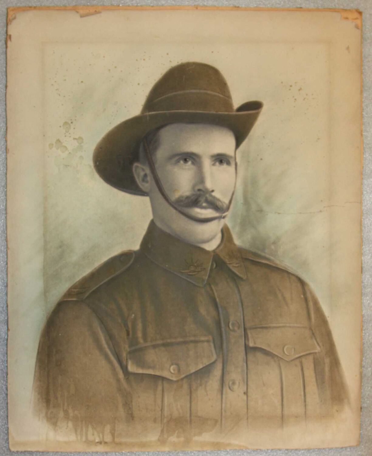 Portrait of Private William Nairn, who served in World War I (service no. 3217) and was killed in the trenches of France on 4 July 1918. This portrait is likely to have been colourised and displayed in a frame in his memory by members of his family - possibly his wife Eileen or sister Sarah Jackson.