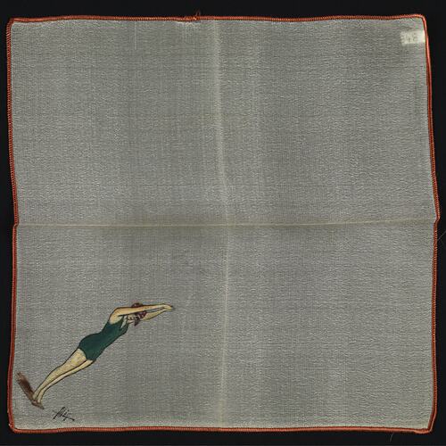 Fine ivory silk handkerchief with red machine-stitched edging. Hand-painted figure of a female diver in a green one-piece swimming suit and red-and-white spotted headscarf, standing with arms above her head preparing to dive from a board. Artist's signature next to illustrated figure.