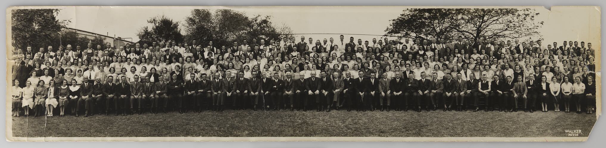Black and white, panoramic staff portrait taken at the Kodak Australasia Pty Ltd factory, Abbotsford, 1934.