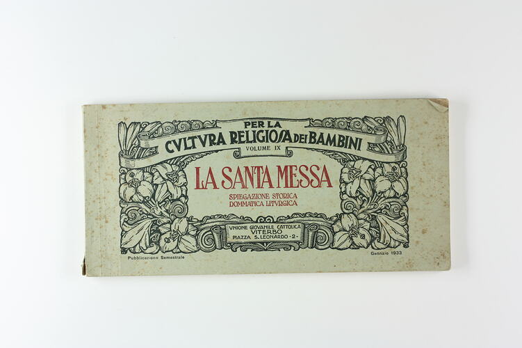 Book, 'La Santa Messa' (The Holy Mass) published by Unione Giovanile Cattolica, Viterbo, Italia, 1933. The book, produced to provide Catholic education for children, was brought by Giuseppe (Joe) Tesoriero to Australia when he migrated from Italy in 1937. It remained amongst his small number of possessions while he was detained as an enemy alien during World War II.