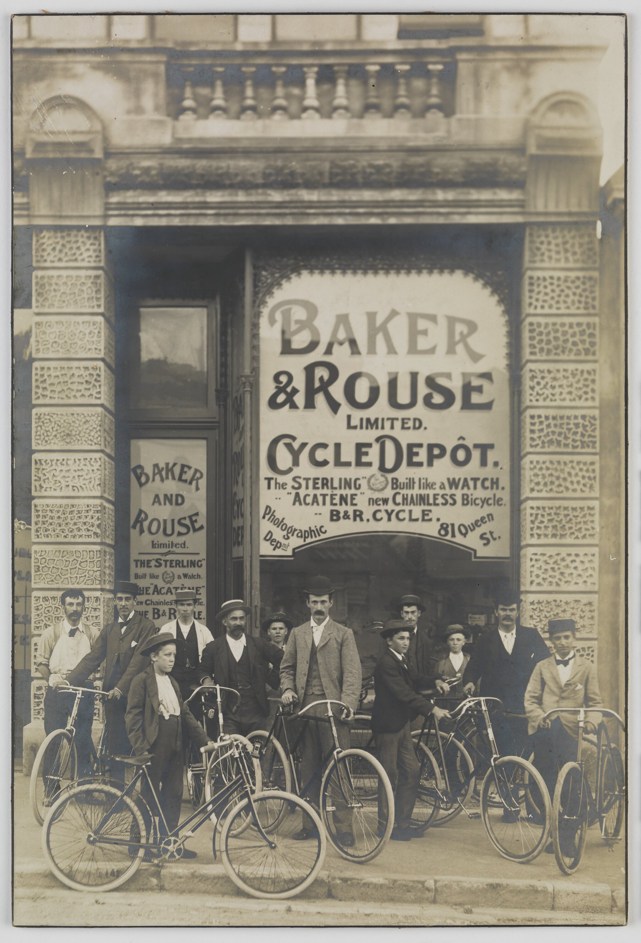 Exterior view of the Baker & Rouse Ltd cycle depot store in Queen Street, Brisbane. A group of eight men and four boys are posed in front of the store, most are holding a bicycle. A sign printed on the store window behind them reads; 'Baker & Rouse Limited. Cycle Depot. The sterling built like a watch. Acatene new chainless bicycle. B&R Cycle. Photographic Depmt 81 Queen St.'