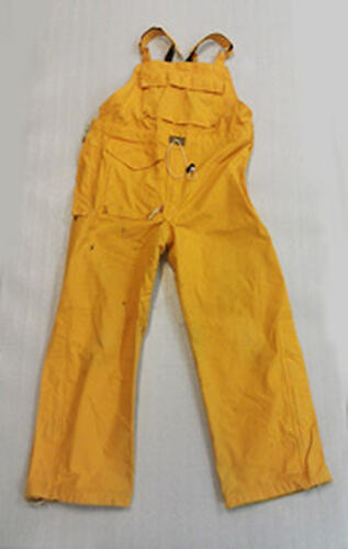 Provided to Museum Victoria by the Australian Antarctic Division in 2007 for in an International Polar Year display at the Discovery Centre, Melbourne Museum. Used by staff at the Australian Antarctic Division, the overalls were probably issued from, and returned to, a supply depot.