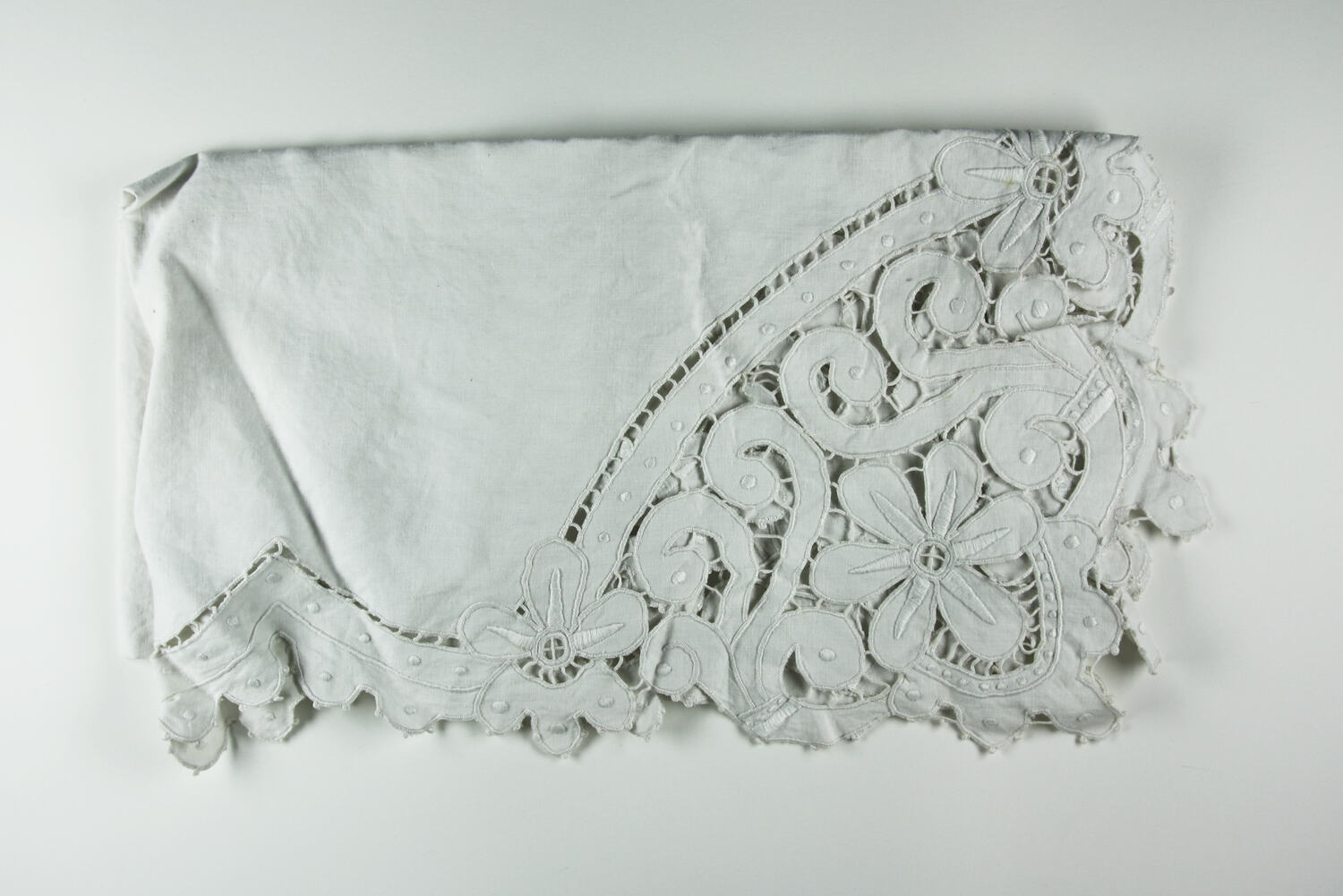 Cutwork tablecloth, off-white, with floral pattern along borders, widening at corners. It shows a range of techniques indicating a high level of skill or commercial manufacture.