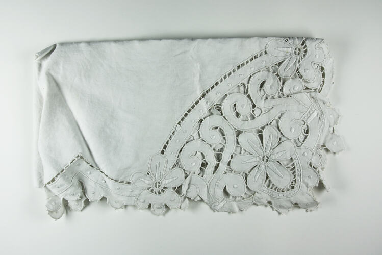 Off-white cutwork tablecloth. Part of a collection of material relating to the McKenzie-Baldwin-Boxshall-Roberts families, settlers in 19th century Victoria in the vicinity of Hanging Rock. Christina Dorothy McKenzie, nee Baldwin (1863-1948), the most likely maker, was known to work by lamplight at 'delicate occupations' such as lace-making for two hours before going to bed at nine o'clock.