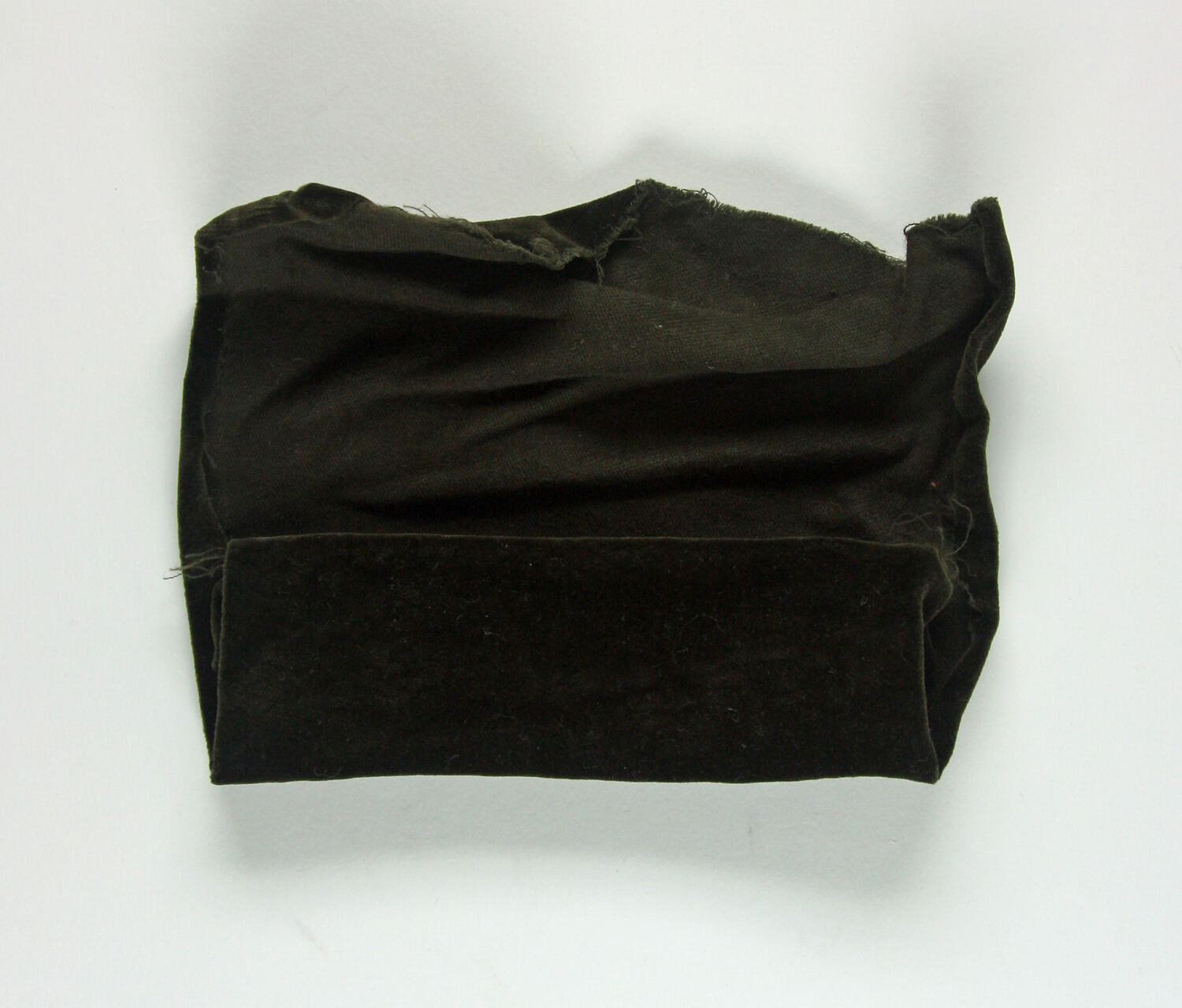 Fragment of velvet fabric from the wedding dress worn by Christina Dorothy Baldwin when she married Alexander McKenzie on 13 December 1887. It was rolled up with an explanatory note from the donor: 'Piece of Mum's wedding dress / Christina Dorothy'.