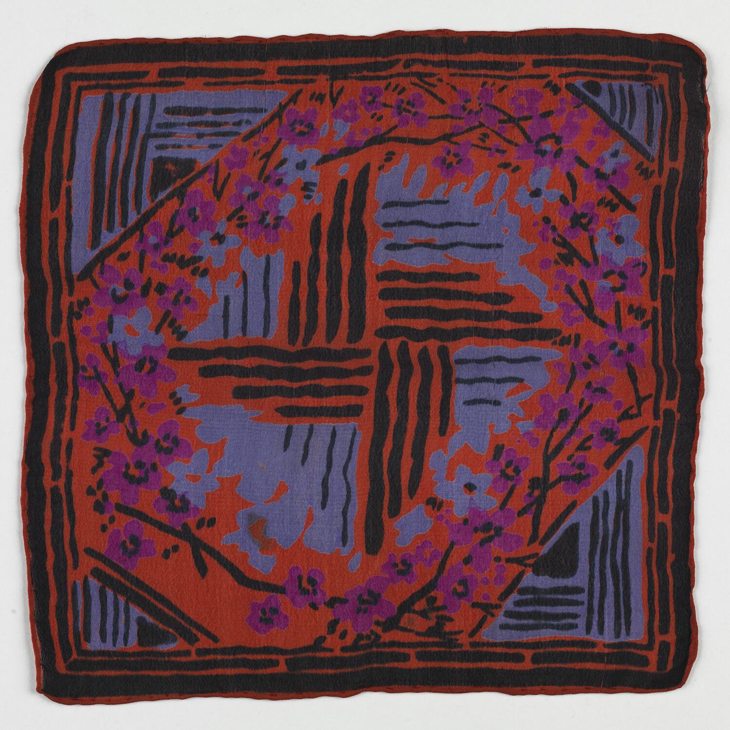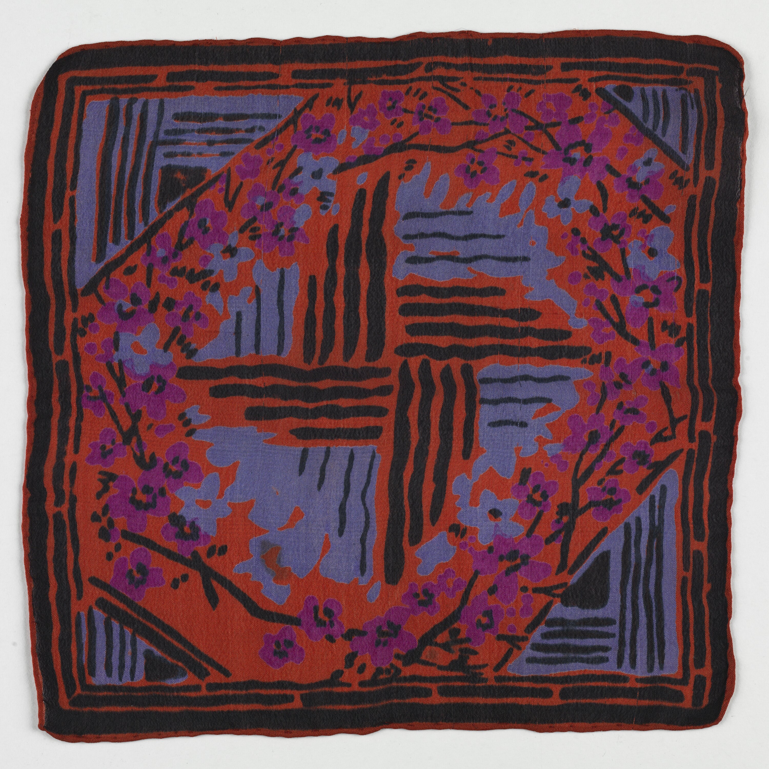 This silk handkerchief, featuring cherry blossom designs, may have been made in Japan for European/American export or appeared at the Japanese Pavilion in the 1933 Chicago World Fair, where other handkerchiefs from this collection were acquired.