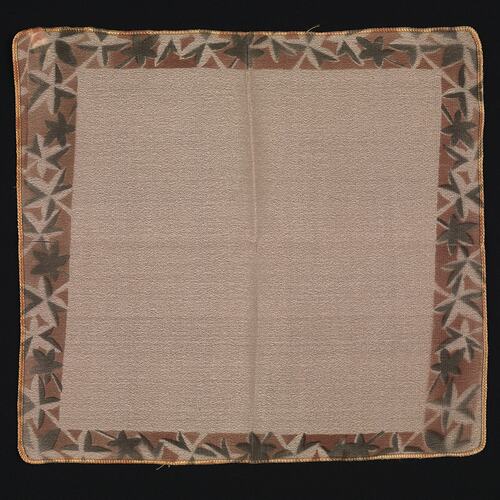 This salmon-pink silk handkerchief features a border of printed leaves. It may have been made in Japan for European/American export or appeared at the Japanese Pavilion in the 1933 Chicago World Fair, where other handkerchiefs from this collection were acquired.