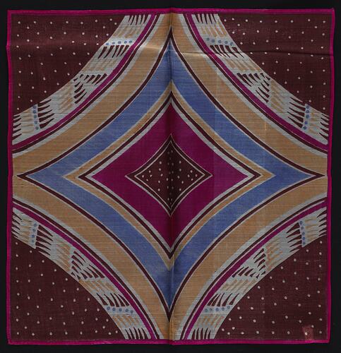 This silk handkerchief features bold printed colours and shapes. It may have been made in Japan for European/American export or appeared at the Japanese Pavilion in the 1933 Chicago World Fair, where other handkerchiefs from this collection were acquired.