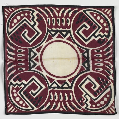 Heavy white cotton handkerchief with hand rolled edge and Batik design (wax resist technique). Geometric and circular forms in burgundy and black ink. Shapes in the circles in each corner suggestive of umbrellas and rain?