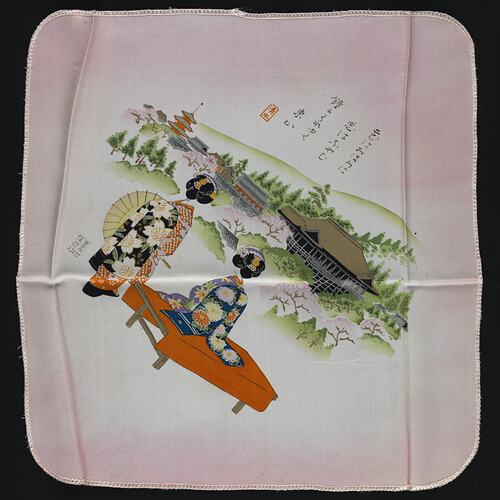 Heavy silk handkerchief with machine-stitched edge and printed image. Image is of the back of two Japanese women, one seated on a blanketed bench , the other standing. They look out at a view of palaces, temples and buildings in a forested valley with cherry blossoms . They both wear kimono and decorative hair pieces. One has platform sandals and holds a large fan. There is a poem and makers mark/signature stamped in black ink on the handkerchief.
