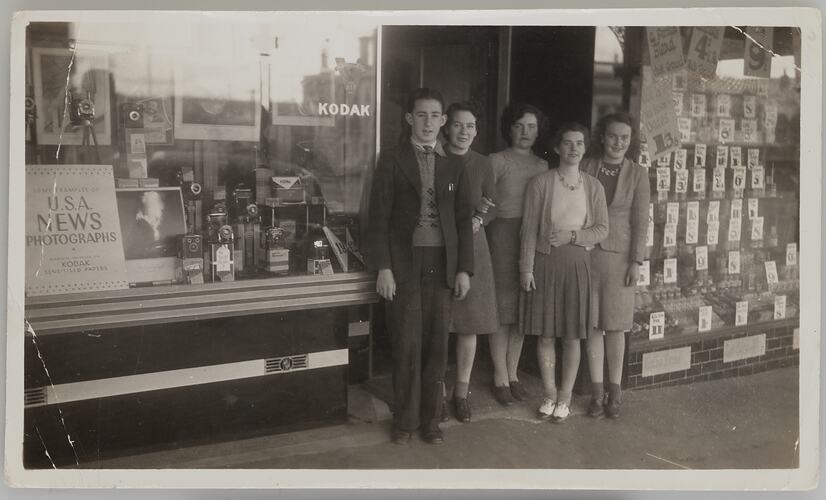 Four women and one young man standing in the doorway of a shop with a glass-fronted window display filled with photographs and cameras and 'KODAK' written on the window.