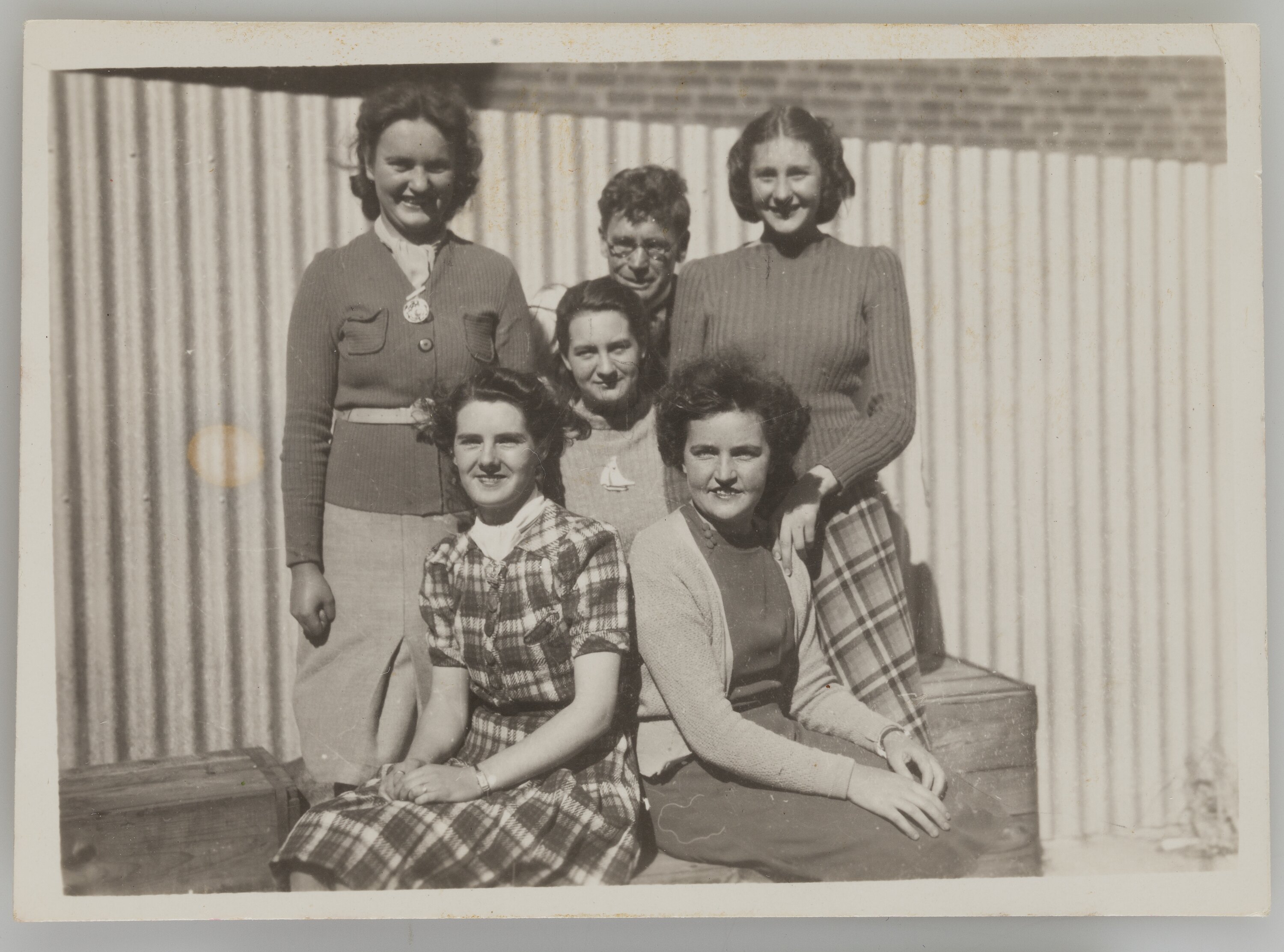 Five women and one man posing in front of a corrugated iron fence. Two girls seated, two people crouching, and two girls standing.
