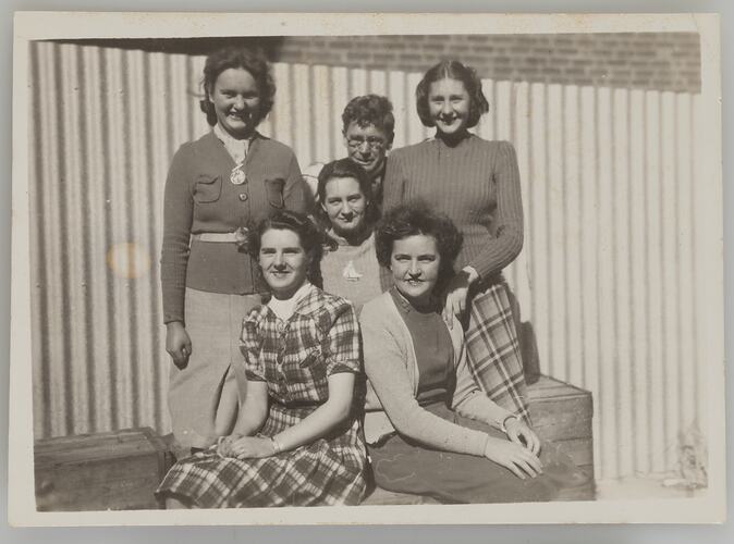 Black and white photograph featuring a staff portrait of Kodak Ballarat staff posing together out the back of the store, circa 1940. This photograph belonged to Connie Kennedy (nee McIntyre) who was 19 years old when she worked for the store for one year, during World War II.