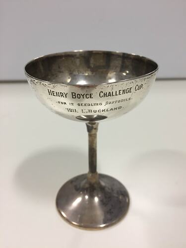 Cup awarded to the donor's grandfather, Leonard Vine Buckland, of Camperdown. Henry Boyce was a prominent grower of daffodils in the early 20th century. This perpetual cup was awarded for 12 distinct varieties raised by the exhibitor.