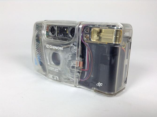 Factory sample of a Chinon GLAF transparent body 35mm camera, belonging to former Kodak product manager John Waddell. John worked in sales and marketing for both Kodak Australasia and Eastman Kodak during his career. Chinon operated out of Japan and in the late 1990s Kodak acquired a controlling share in the company. This is an early example of the products released by Asian Kodak subsidiary companies which entered the market in the 1990s and proved to be significant competition for Australian manufacturing.
