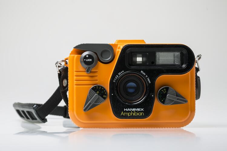 Amphibian 35mm underwater camera with 35mm, 2.8 lens, distributed by Hanimex, circa 1983.