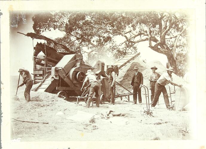 Photograph showing a typical 'Mallee country' harvesting scene of period c.1880s-1915. Shown in the scene are a horse treadmill operating a winnowing machine that is processing a cereal crop that would have initially been removed with a stripper. This image is particularly impressive with the level of detail shown in the photo (such as the bag trollies, workers, etc) and the clarity and obvious professional composition of the views.