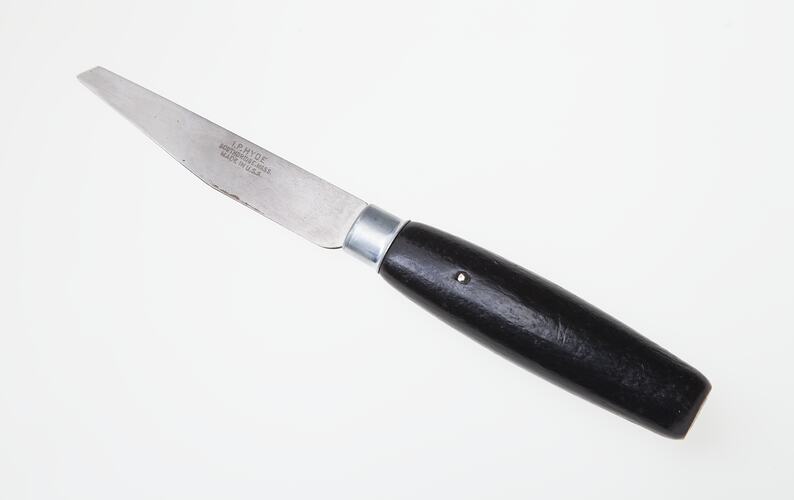 Knife used by a former Kodak Australasia factory worker in the Sensitising and Emulsions sections of the Kodak factory to slit sections of photographic paper during manufacture. It was stored inside a utility belt pouch for easy access.
