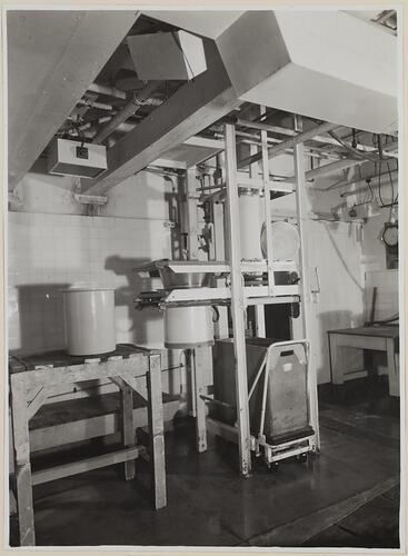 Monochrome photograph of a large emulsion press at Kodak Australasia Pty Ltd, Abbotsford. Used for pressing emulsion prior to washing.