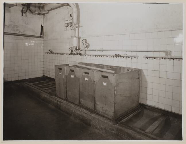Monochrome photograph of four wash-boxes at Kodak Australasia Pty Ltd, Abbotsford. The boxes are positioned inside a room.