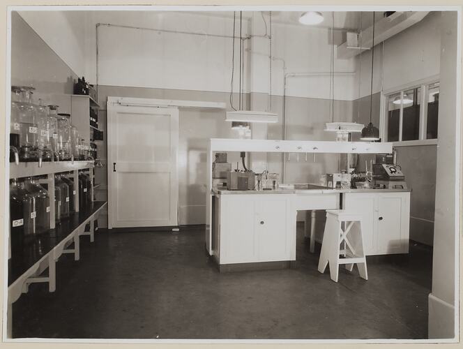Monochrome photograph of the doctor room at Kodak Australasia Pty Ltd, Abbotsford. The equipment in this section is divided in two groups. First group is for preparation, storage and measurement of the doctor solutions into batch lots. The second is for determination of emulsion pH and emulsion PAg.