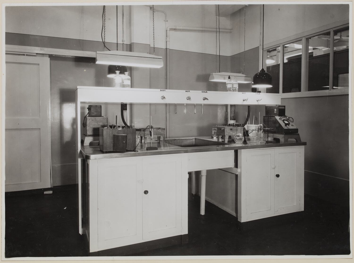 Monochrome photograph of a bench fitted for pH and PAg determination in doctor room at Kodak Australasia Pty Ltd, Abbotsford.