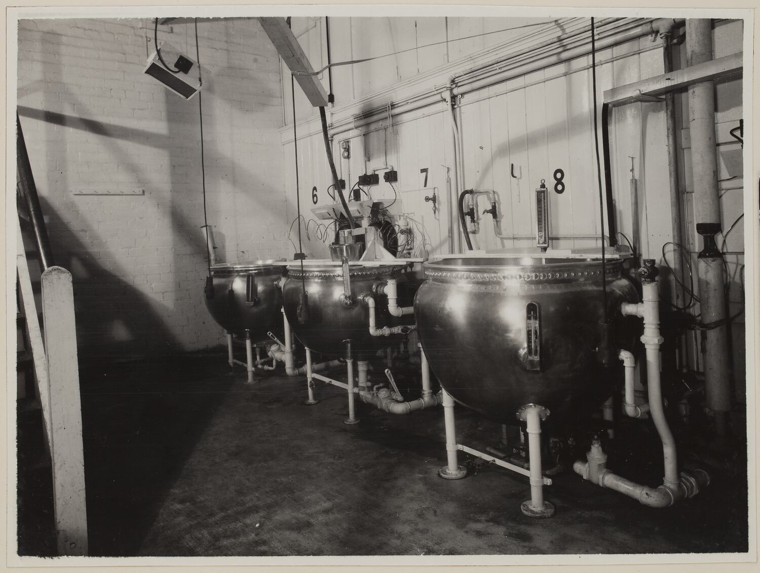 Monochrome photograph of three kettles in the paper holding room at Kodak Australasia Pty Ltd, Abbotsford. The kettles service room one.