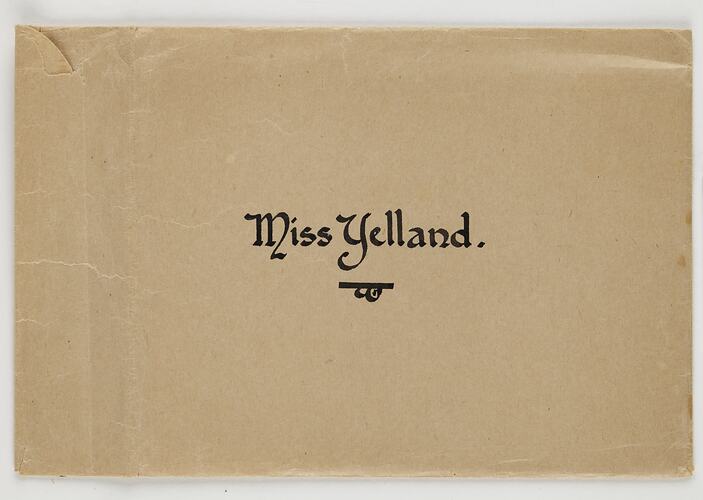 Envelope which originally housed a farewell card for Miss B Yelland (Beryl), from the Kodak Office Staff, Abbotsford, wishing her the best for her future married life, along with a handwritten note and a photograph of tennis players.