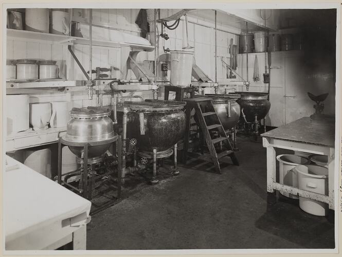 Monochrome photograph of the paper emulsion mixing room in the old Emulsion Department at Kodak Australasia Pty Ltd, Abbotsford. The room was in use until May, 1942.
