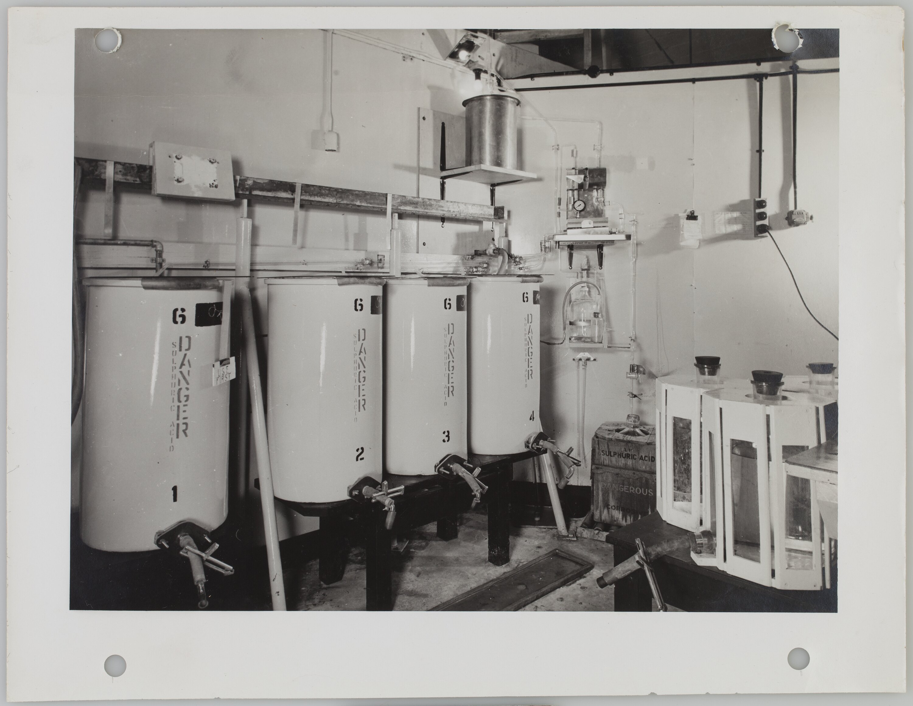 Monochrome photograph of sulphuric acid in large containers at Kodak Australasia Pty Ltd, Abbotsford. Possibly taken in the testing department.