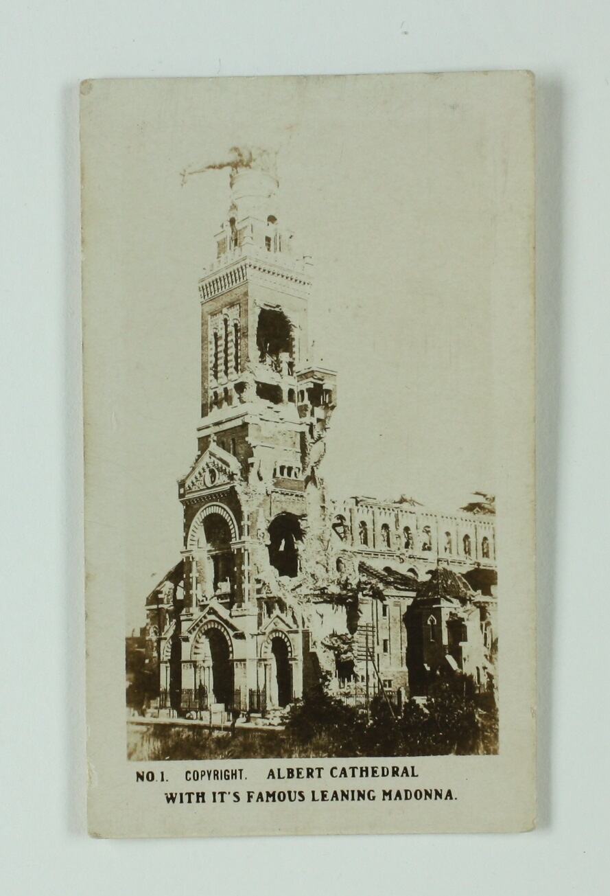 No. 1 in the series of World War I cigarette cards produced by Magpie Cigarettes. This image is titled 'Albert Cathedral With It's Famous Leaning Madonna'. It depicts a cathedral bell tower. The images on this series of cigarette cards are official World War I photographs which were displayed at the Australian War Museum, Exhibition Buildings, Melbourne.