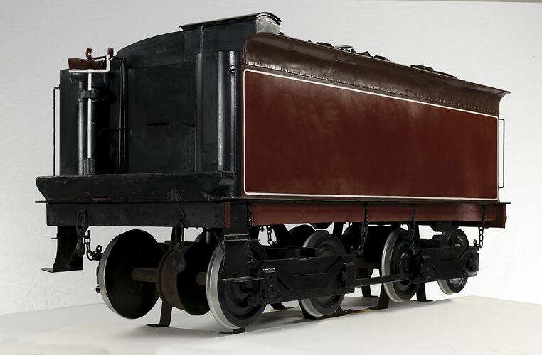 Third size scale model of the tender of steam locomotive C1, designed and built by the Victorian Railways at the Newport Workshops in 1917, and issued to traffic (launched operative) on 9 March 1918. It had a tractive effort of 38,400 lbs (170 kN). It was dismantled on 10 August 1961, having completed 1,155,167 miles of service (1,859,061 km). It was restored by V-Line in the 1980s.
