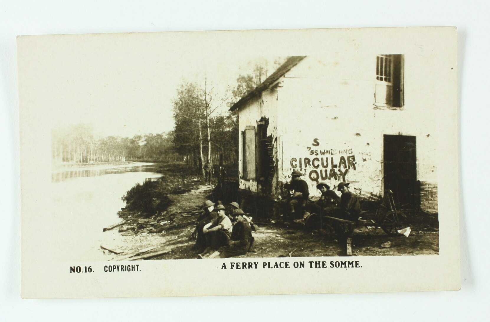 No. 16 in the series of World War I cigarette cards produced by Magpie Cigarettes. The image is titled 'A Ferry Place on the Somme'. It depicts soldiers resting on the banks of a river next to a small building. The images on this series of cigarette cards are official World War I photographs which were displayed at the Australian War Museum, Exhibition Buildings, Melbourne.