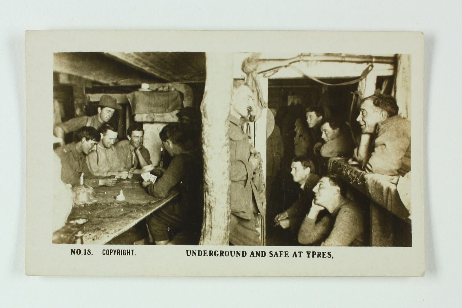 No. 18 in the series of World War I cigarette cards produced by Magpie Cigarettes. The image is titled 'Underground and Safe at Ypres'. It depicts soldiers relaxing in an underground bunker. The images on this series of cigarette cards are official World War I photographs which were displayed at the Australian War Museum, Exhibition Buildings, Melbourne.