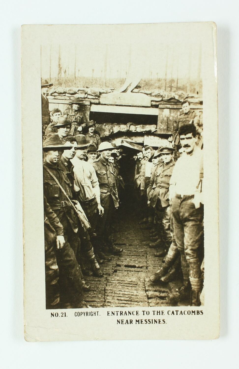 No. 21 in the series of World War I cigarette cards produced by Magpie Cigarettes. The image is titled 'Entrance to the Catacombs near Messines'. It depicts soldiers standing outside the entrance to catacombs. The images on this series of cigarette cards are official World War I photographs which were displayed at the Australian War Museum, Exhibition Buildings, Melbourne.
