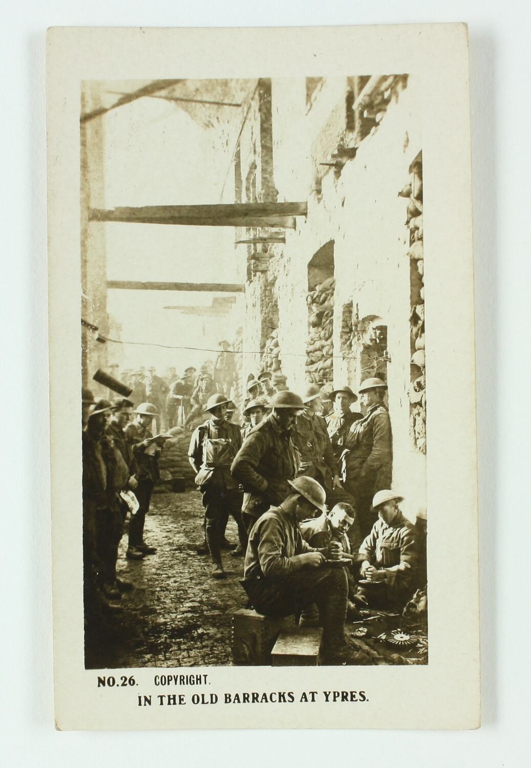 No. 26 in the series of World War I cigarette cards produced by Magpie Cigarettes. The image is titled 'In the Old Barracks at Ypres'. It depicts soldiers relaxing in an alley between two buildings. The images on this series of cigarette cards are official World War I photographs which were displayed at the Australian War Museum, Exhibition Buildings, Melbourne.
