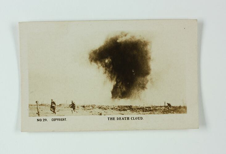 No. 29 in the series of World War I cigarette cards produced by Magpie Cigarettes. The image is titled 'The Death Cloud'. It depicts two soldiers running from a cloud of mustard gas. The images on this series of cigarette cards are official World War I photographs which were displayed at the Australian War Museum, Exhibition Buildings, Melbourne.