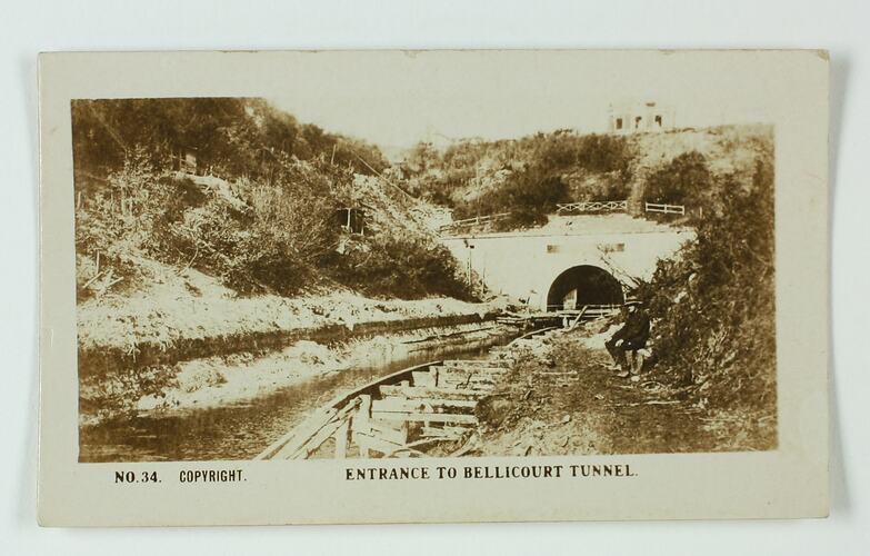 No. 34 in the series of World War I cigarette cards produced by Magpie Cigarettes. The image is titled 'Entrance to Bellicourt Tunnel'. It depicts a soldier sitting next to a canal and train tracks. The images on this series of cigarette cards are official World War I photographs which were displayed at the Australian War Museum, Exhibition Buildings, Melbourne.