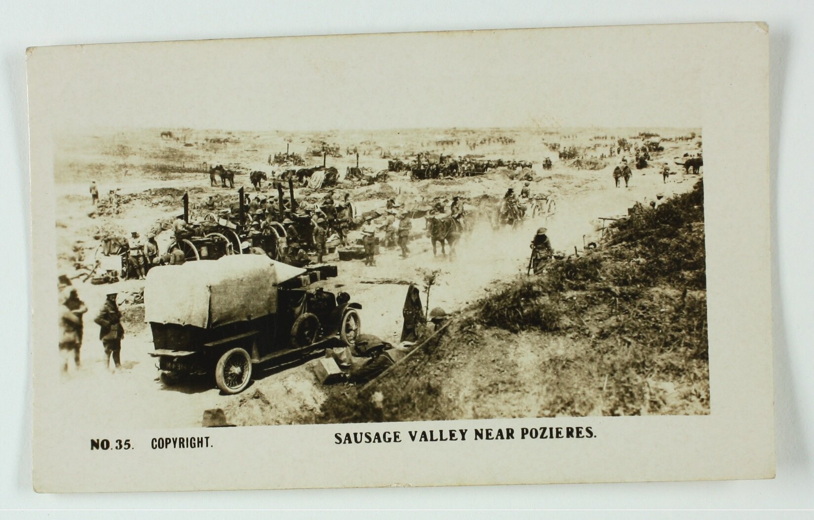 No. 35 in the series of World War I cigarette cards produced by Magpie Cigarettes. The image is titled 'Sausage Valley near Pozieres'. It depicts soldiers, horses and a car on a dirt road, the soldiers are setting up artillery. The images on this series of cigarette cards are official World War I photographs which were displayed at the Australian War Museum, Exhibition Buildings, Melbourne.