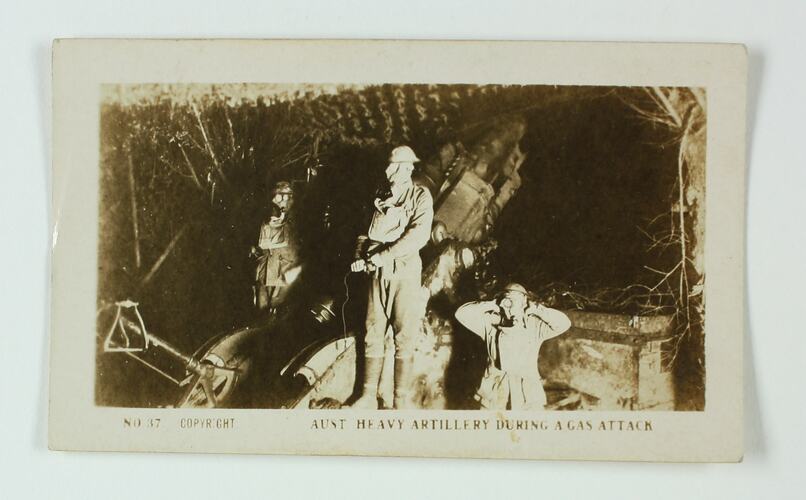 No. 37 in the series of World War I cigarette cards produced by Magpie Cigarettes. The image is titled 'Aust. Heavy Artillery During a Gas Attack'. It depicts three Australian soldiers wearing gas masks standing beside artillery. The images on this series of cigarette cards are official World War I photographs which were displayed at the Australian War Museum, Exhibition Buildings, Melbourne.
