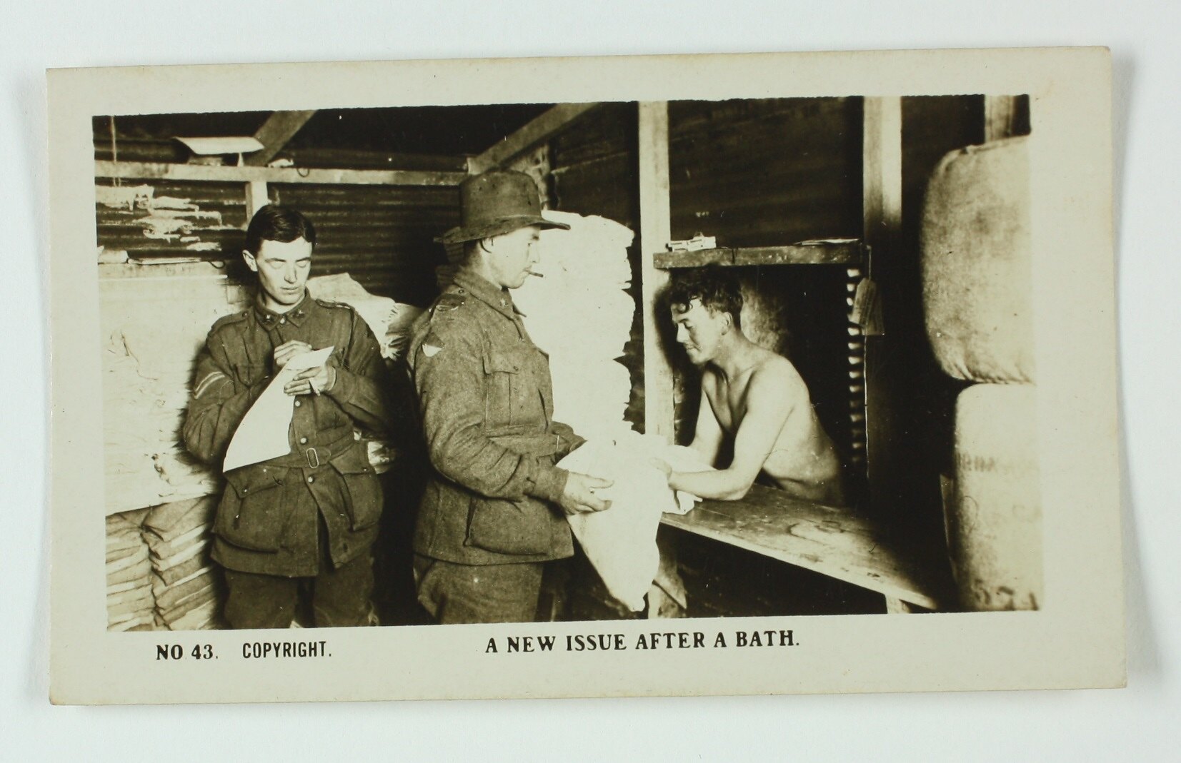 No. 43 in the series of World War I cigarette cards produced by Magpie Cigarettes. The image is titled 'A New Issue After a Bath'. It depicts three soldiers two in uniform, one is handing the third soldier a towel and the other is checking a document, the soldiers are in a room stacked with towels. The images on this series of cigarette cards are official World War I photographs which were displayed at the Australian War Museum, Exhibition Buildings, Melbourne.