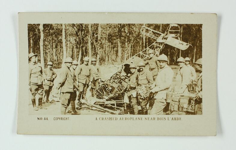 No. 44 in the series of World War I cigarette cards produced by Magpie Cigarettes. The image is titled 'A Crashed Aeroplane Near Bois L'Abbe'. It depicts soldiers standing around a crashed aeroplane. The images on this series of cigarette cards are official World War I photographs which were displayed at the Australian War Museum, Exhibition Buildings, Melbourne.