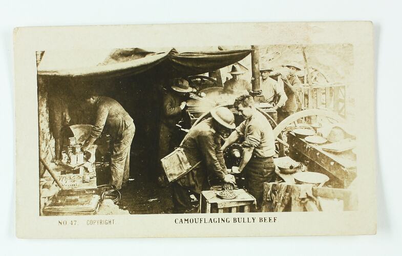 No. 47 in the series of World War I cigarette cards produced by Magpie Cigarettes. The image is titled 'Camouflaging Bully Beef'. It depicts soldiers in a makeshift kitchen with cans and plates around them, they are using a machine to mince meat. The images on this series of cigarette cards are official World War I photographs which were displayed at the Australian War Museum, Exhibition Buildings, Melbourne.