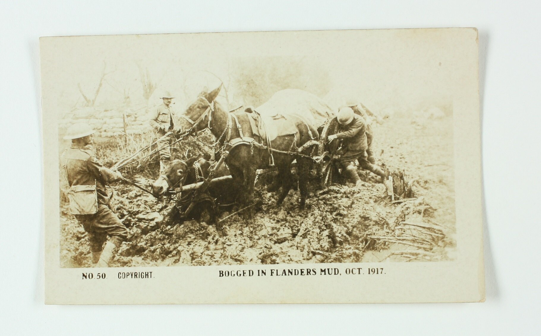 No. 50 in the series of World War I cigarette cards produced by Magpie Cigarettes. The image is titled 'Bogged in Flanders Mud, Oct. 1917'. It depicts soldiers trying to pull two horses and a wagon that have gotten bogged in the mud. The images on this series of cigarette cards are official World War I photographs which were displayed at the Australian War Museum, Exhibition Buildings, Melbourne.