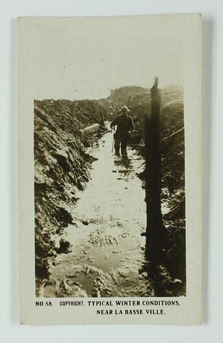 No. 58 in the series of World War I cigarette cards produced by Magpie Cigarettes. The image is titled 'Typical Winter Conditions, Near La Basse Ville'. It depicts a soldier walking through a trench that is knee high with water. The images on this series of cigarette cards are official World War I photographs which were displayed at the Australian War Museum, Exhibition Buildings, Melbourne.